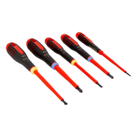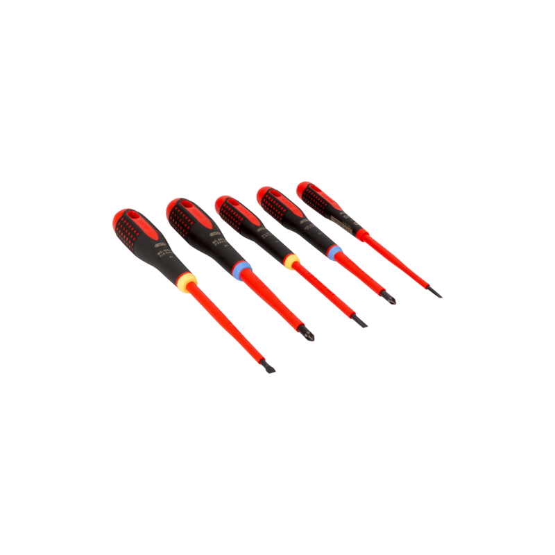 El juego incluye cinco unidades, para tornillos de cabeza plana y Pozidriv BE-8220S, BE-8040S, BE-8050S 0,5 mm x 3 mm x 100 mm, 0,8 mm x 4 mm x 100 mm y 1 mm x 5,5 mm x 125 mm planos BE-8810S, BE-8820S PZ1 x 80 mm, PZ2 x 100 mm Pozidriv Destornillador desarrollado acorde al proceso científico ERGO™ Punta fosfatada para mayor precisión proporciona un ajuste preciso y sin descamación Para trabajar en equipos de baja tensión de hasta 1000 V Mango de tres componentes para la máxima comodidad del usuario, material suave con superficie acanalada que proporciona un agarre superior y una mayor transmisión de fuerza Máximo confort con el mínimo esfuerzo gracias a un diseño ergonómico Fácil de elegir la punta correcta con el mango codificado por colores y el símbolo permanente en el extremo curvado La varilla cilíndrica con diámetro pequeño ayuda a apretar y aflojar los tornillos rápida y fácilmente Longitud óptima en el cuello del mango los dedos siempre están colocados correctamente para un giro rápido y un control de precisión Agujero colgante integrado Cara plana anti-rodadura en el mango Acero aleado de alto rendimiento, aislamiento moldeado directamente sobre la hoja Inspeccionado individualmente y fabricado según IEC 60900, probado en un baño de agua a 10000 V Para trabajar en equipos de baja tensión de hasta 1000 V En caja de cartón