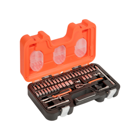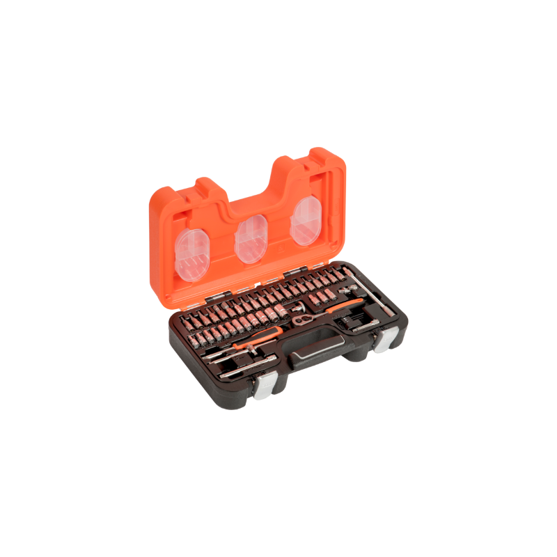 12 vasos hexagonales de 1/4 : 4, 4,5, 5, 5,5, 6, 7, 8, 9, 10, 11, 12, 13 mm. 1 carraca de 1/4 con liberación rápida, 60 dientes y un ángulo de acción de 6°. 4 llaves de vaso Phillips de 1/4 : PH1, PH2, PH3 y PH4. 3 llaves de vaso ranuradas de 1/4 : 4, 5,5 y 7 mm. 6 llaves de vaso hexagonales de 1/4 : 3, 4, 5, 6, 8 y 10 mm. 7 llaves de vaso de 1/4 : T8, T10, T15, T20, T25, T27 y T30. 3 vasos TORX de 1/4 : E6, 7 y 8. 1 disco giratorio de 1/4 . 2 alargaderas de 1/4 : 2 y 4 . 1 mango corredizo en T de 1/4 . 1 articulación universal de 1/4 . 1 mango giratorio bi-componente de 1/4 . 1 alargadera flexible de 1/4 : 150 mm/6 . Tres llaves hexagonales: 1,5, 2 y 2,5 mm. 3 cajas de plástico con tres secciones extraíbles y tapa. Acabado mate. Aleación de acero de alto rendimiento Los fijadores sufren menos desgaste y daños gracias a los vasos con perfil Dynamic-Drive™. Botón de liberación rápida de los vasos de la carraca. Maletín: polietileno de alta densidad PEAD . Normas: ISO 1174 y DIN 3120.