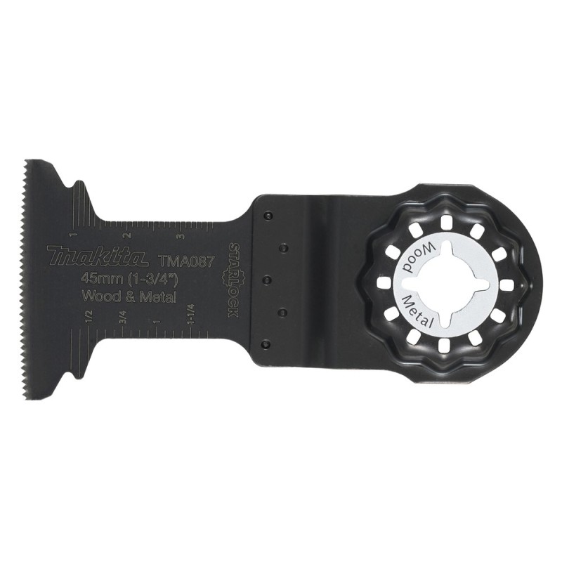 Descripción Hoja bimetálica STARLOCK para herramienta multifunción, indicada para cortar aluminio, madera, epoxi y placas de yeso. Dimensiones: 45 mm de ancho, 45 mm de longitud de trabajo, 20 TPI. Suministrada en paquetes de 1 unidad.