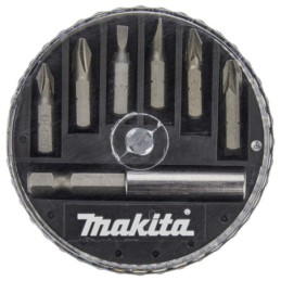 Juego de puntas para atornilladores. El paquete contiene 6 puntas de atornillar con una longitud de 25 mm (PH1, PH2, PZ2, PZ3, SL3, SL5) y un portapuntas magnético de 60 mm. Total de 7 piezas con estuche de plástico.