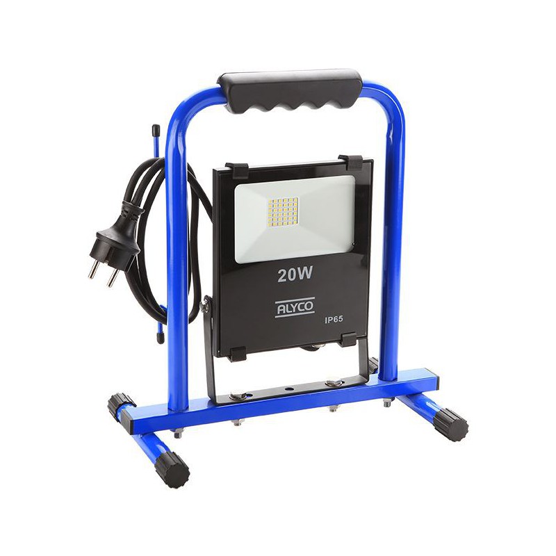 Proyector de luz tipo SMD de 20W de potencia. con 2.200 Lumenes de intensidad lumínica de luz blanca. en un soporte metálico con patas. inclinable y con gran protección IP65 ante polvo y humedad. De clase energética A+.